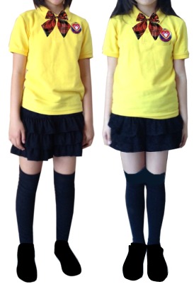上は、黄色(デイジー)のポロシャツにスクールリボン、合唱団の缶バッチをつけます。