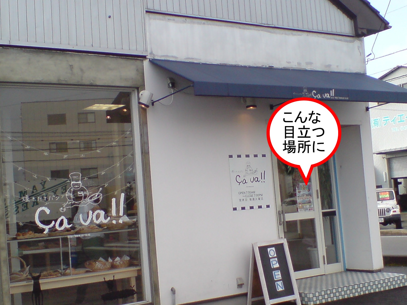 店を出て、車に乗るころには、もう貼ってありました。お店のいりくち近くです。うれしかったなあ。